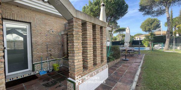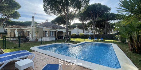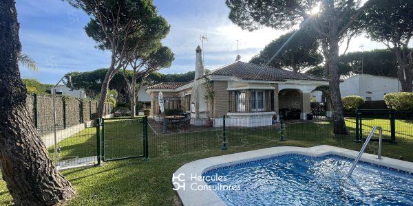 Casa América, es una espaciosa casa situada a 500 m de la playa con jardín alrededor de toda la casa y piscina privada vallada de doble acceso. La casa puede alojar hasta 8 personas ya que cuenta con 4 habitaciones todas ellas con A/C y 3 baños con plato de ducha. El salón- comedor cuenta con una zona compuesta por dos sofás y zona de lectura, alrededor de la TV y con acogedora chimenea para las épocas más frías, así como una mesa de comedor para 8 personas. La cocina está completamente equipada( lavavajillas, horno, microondas, y frigorífico), y además tiene acceso a un tendedero/ lavadero donde se ubica la lavadora y un segundo frigorífico. Se facilitan además sombrillas, sillas, y nevera para llevar a la playa. Desde el salón se accede al porche, el cual cuenta con una zona de comedor `para 8 personas, y un ambiente más relajado con una mesa y cuatro sillas de ratán. Además la parcela cuenta con un tercer ambiente exterior, ubicado en torno a la barbacoa con una mesa y sillas para 6/8 personas. En el jardín tanto en el interior como en el exterior del vallado de la piscina, hay ubicadas tumbonas (6 en total).