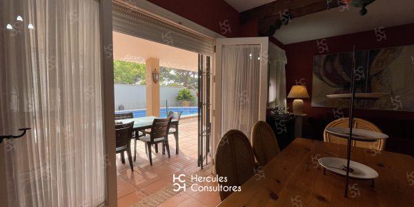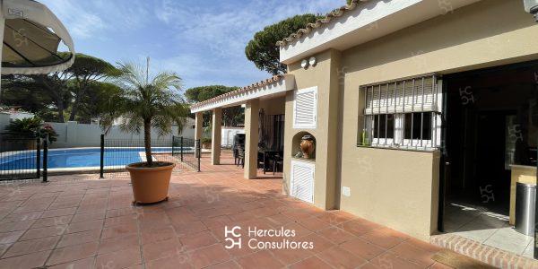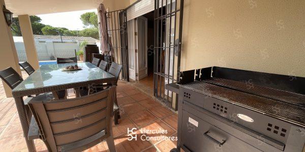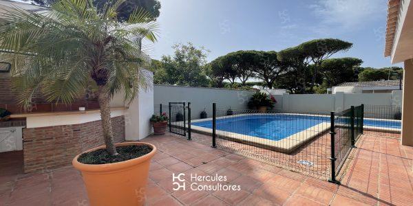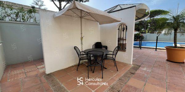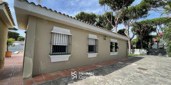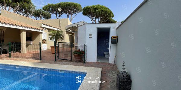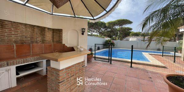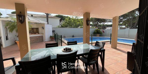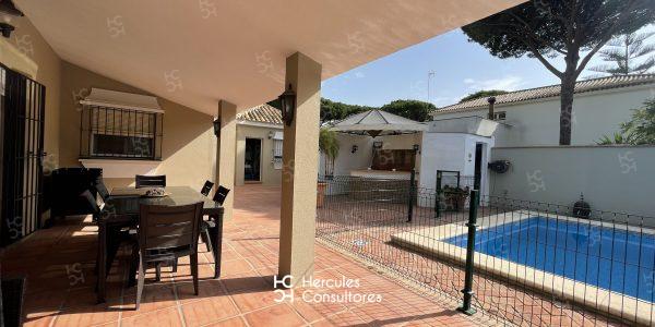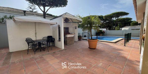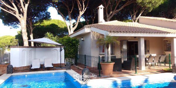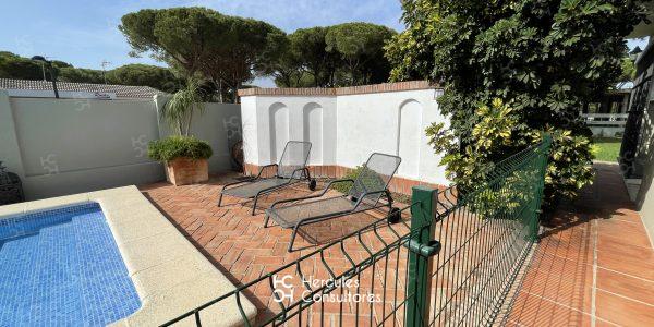 Chalet situado dentro de la Urbanización de Roche, a tan solo 300 m de la playa, con jardín privado y piscina vallada. Cuenta con parcela de 950 m2 y vivienda de 200 m2. El porche está amueblado con una mesa con sillas, sofá, y dos tumbonas. Cuenta con un chiringuito exterior con barra y barbacoa portátil. La parcela cuenta con capacidad para aparcar 3/ 4 coches. Capacidad : 6 (7) personas. La casa está distribuida en una sola planta. Tiene 3 dormitorios (1 con cama de matrimonio de 1,50 cm, otro con cama de matrimonio de 1,50 cm, mas una cama de 90 cm, y el último con dos camas de 90 cm). Dispone de 2 baños con bañera, y uno exterior con ducha. No admite mascota. Disponibilidad: ALQUILADA