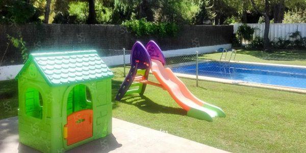 Casa distribuida en dos alturas, provista de escalera con valla de seguridad para niños. Cuenta con 4 dormitorios, y 4 baños. Capacidad para 8 personas. Con 1.200 m2 de parcela. Barbacoa portátil. En el jardín cuenta con juegos para niños ( tobogán, casita, etc. ) Dispone de wifi. Disponibilidad: